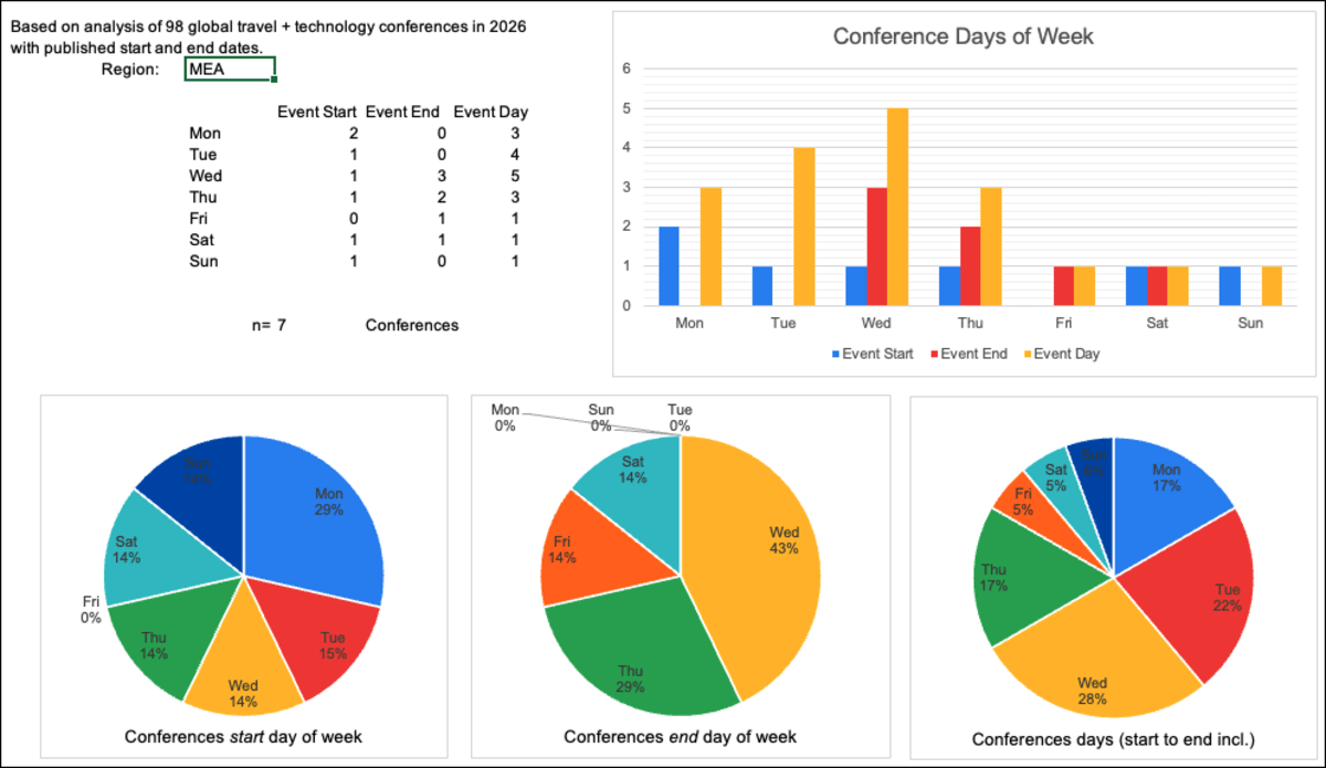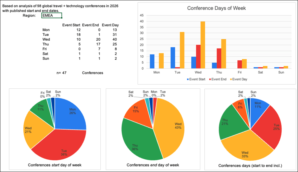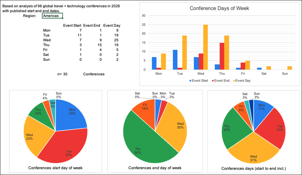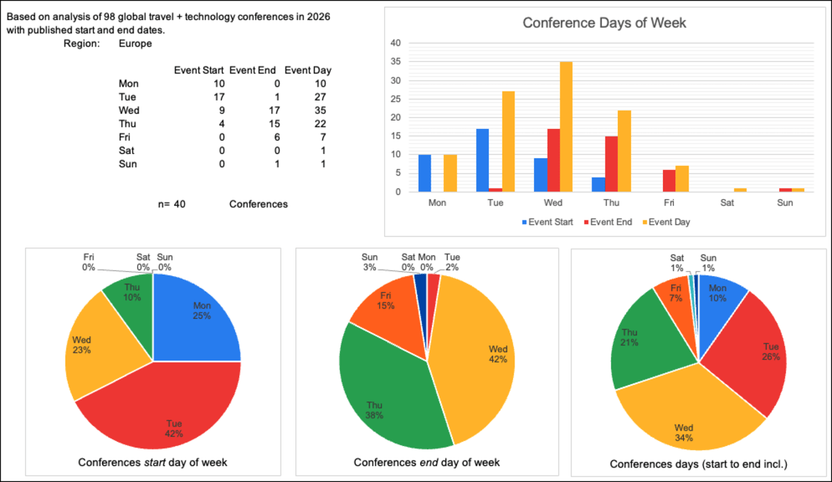 Based on 100 global travel tech conferences in 2026, I analysed which weekdays conferences are running on. I'm not sure how useful this is to conference organisers, since this is mostly stuff you knew already, but here's the data anyway: 😲 An overwhe... show more