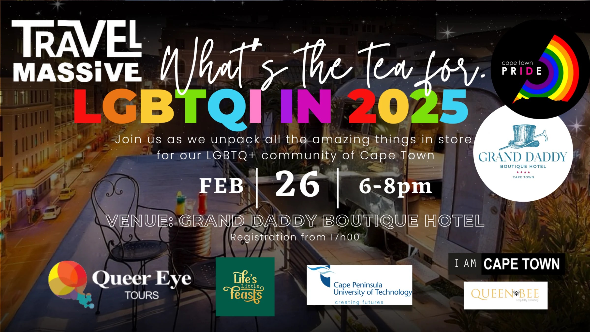 Join us for an evening of connection, inspiration, and celebration at the Grand Daddy Boutique Hotel's Rooftop Bar. Weβre raising the rainbow flag to spotlight the importance of LGBTQI+ tourism in Cape Town and South Africa. Whether youβre part of the travel industry or simply passionate about inclusive tourism, this is an event you donβt want to miss!