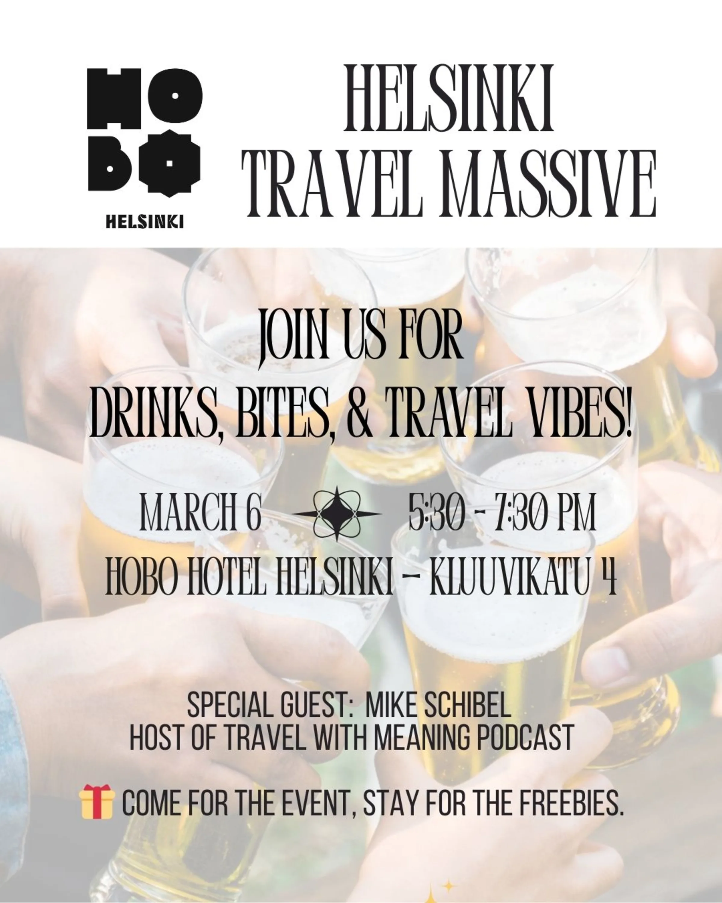 Join Helsinki Travel Massive at HOBO Hotel for a laid-back meetup full of mingling, good conversations, and travel industry connections — no agenda, no pressure, just great people.