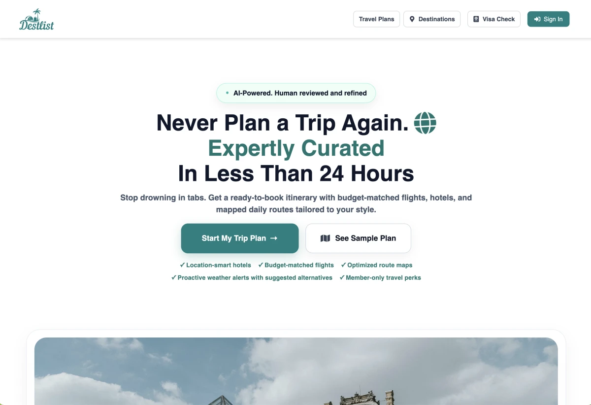 What makes DestList different is its hybrid approach: we combine the speed and intelligence of AI with the judgment, taste, and care of human curation, so every trip feels personal, well-structured, and ready to book.