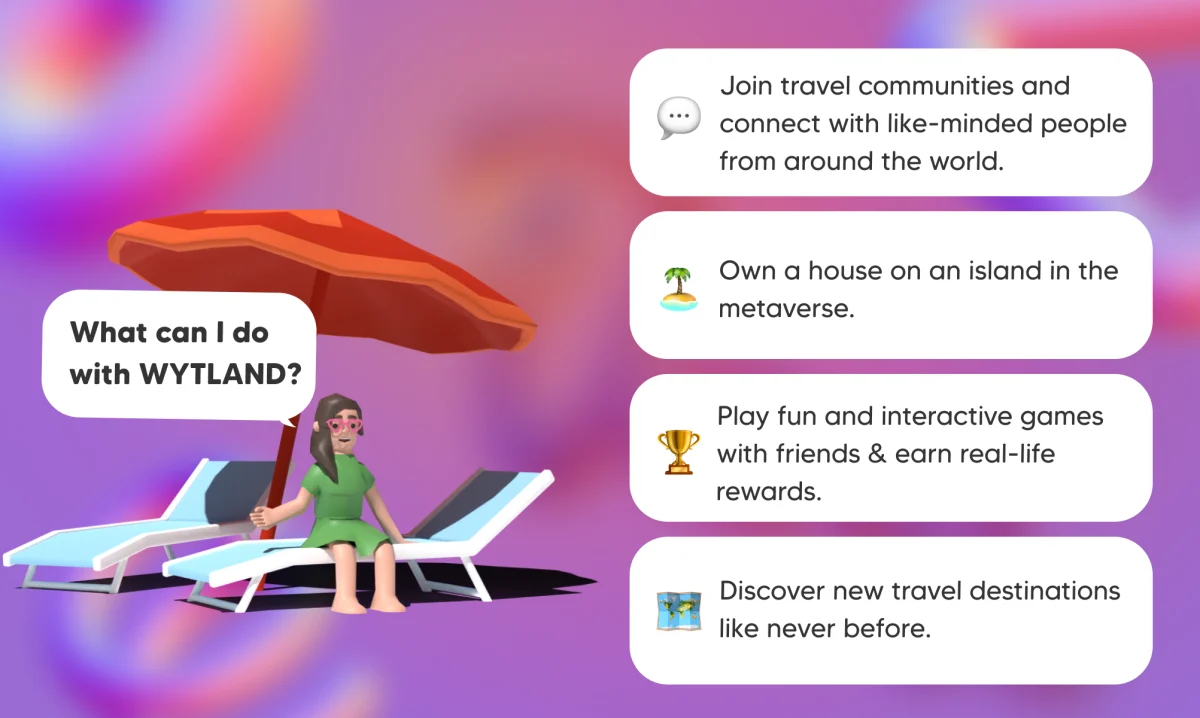 WYTLAND is the social web3 platform for people to join and create travel communities, build meaningful connections with like-minded people, play games in the metaverse and earn real-life rewards. It's also a place for travellers to discover new travel destinations and travel content creators.