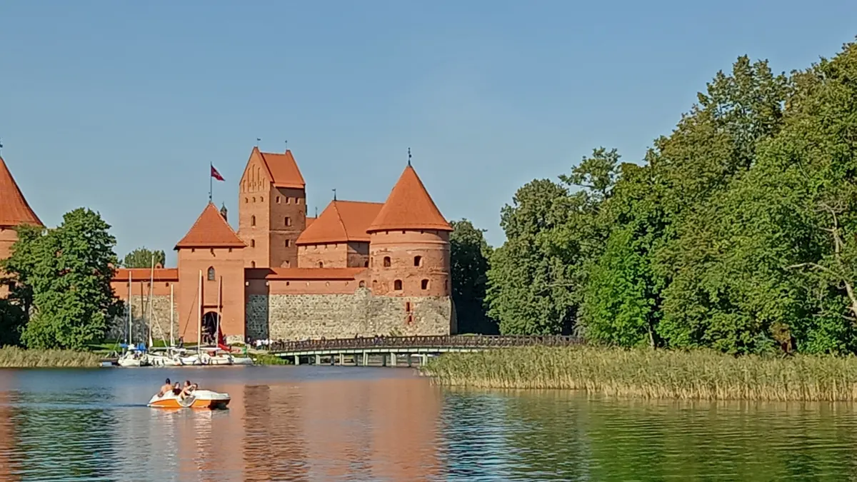 A 14th century castle located in the middle of a lake in Lithuania